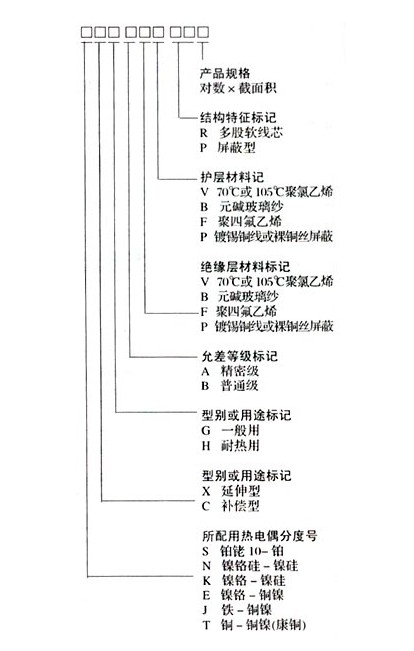 1、補償導線型號按產品的品種劃分為:SC、KC、KX、EX、JX、TX、NC