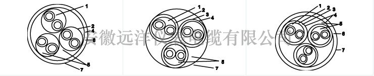 1、對絞線組 2、隔離層 3、對屏蔽 4、隔離層 5、填充 6、總屏蔽 7、隔離層外護套