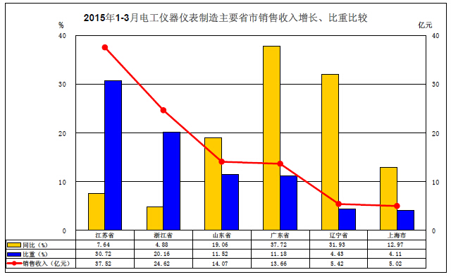1、20151-3月電工儀器儀表業(yè)主省市銷售收入增、比重比較